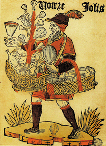 Change the clothes, and change the vessels in the baskets from typical Medieval types to Roman ones, and the hawker of glassware depicted here would transform into the kind of itinerant glassworker who roamed the roadways of Rome's northwestern provinces in the 2nd and 3rd centuries A.D. He would carry with him a tool kit of blowpipes, pincers, shears, and so on, so that he could recycle a chunk of cullet—perhaps more than once, over the years—straight back to the household that brought it to him.