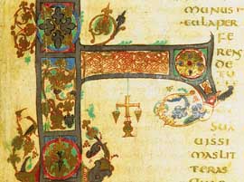 Many of the lamp shapes used in northwestern Europe in early Medieval times derived directly from Roman prototypes. For example, tucked away beneath the one limb of the cross-bar letter "F" in the illuminated lettering of the Moutier Grandval Bible, is a cross-shaped candelabrum with three glass lamps. The outer ones recall the simple Roman conical lamp of the Constantine era, while the central one is reminiscent of the bowl-type lamps that came into favor during the 5th century A.D.