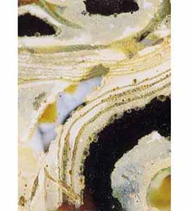 In certain deliberately colored glasses the progress towards disintegration moves quite rapidly. For example, during weathering of opaque red glass (see Coloration), the cuprous oxide needles that cause the coloration are easily converted to a green crust of copper chloride. During the weathering of "onyx" ware (see Mosaic/Cast), the creamy opaque white swirls become heavily pitted while the amber layers between them remain resistant.
