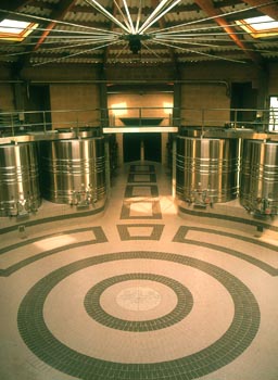Stainless-steel fermentation vats at a Californian winery