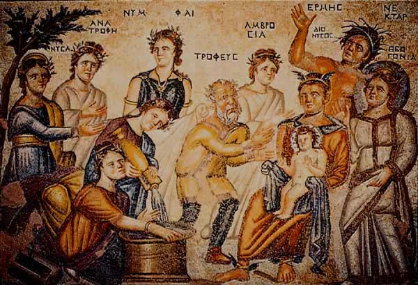 The ongoing confusion between the Bacchic and Christian cults during the Byzantine era is clear in this 5th century A.D. mosaic from Paphos in Cyprus, in which the infant wine-god is portrayed in a setting reminiscent of the Adoration of the Magi. Instead of the traditional maenads and satyrs, the baby Bacchus is surrounded by worshippers that include Ambrosia and Nectar, as divine food and drink, and old Tropheus the Provider (see Johnson 1989). In due time, Christianity was able to usurp several symbols of Bacchic spring's fertility with the Resurrection.