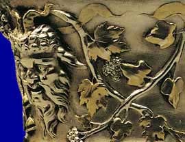 Bacchus mask and vine tendrils on a twin handled cup.