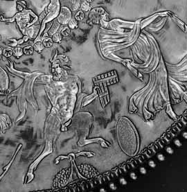 Goat-footed satyr and dancing maenad on a silver dish.