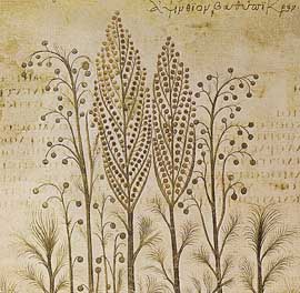 Many of these herbs, such as gentian and hazelwort, could be found on the local hillsides; others, such as rue and marjoram, came from carefully tended kitchen gardens. Certain shrubs—particularly juniper and myrtle—were popular for this purpose as well. Wealthy folk made a point of buying wines that had been spiced with herbs that were imported from afar—saffron from Cilicia, cardamom from the Malabar Coast of India, and resinous myrrh from from Arabia, so that a supper table must at times have smelled more like a perfumers' store than a place to eat.