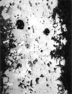 The metal is heavily penetrated by pitting and intergranular corrosion, but in sound regions there are large polyhedral grains that, in their twinning and slight distortion, indicate a treatment of annealing after light cold-working. Scattered through the metal are some large pores introduced during casting. Inclusions vary in size appreciably, and some are elongated in a way that implies both hot- and cold-working deformation. The edge most likely was cold-worked, but the finer grained structure that would confirm that treatment is all but lost to corrosion.