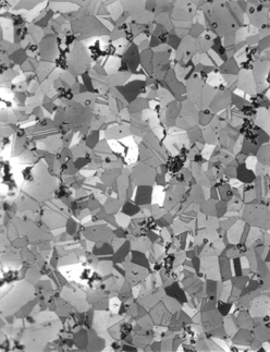 The microstructure consists of polyhedral grains that, in their twinning, are indicative of annealing after moderate cold-working. Shapes of the entrapped inclusions are unusual, varying from pinpoints to fairly large clusters; at grain boundaries, some have the appearance of small fissures.