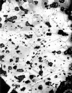 Despite extensive corrosion of this artifacts surface, the microstructure still retains sufficient polyhedral grains that, in their twinning and distortion, do indicate there was a moderate amount of non-uniform cold-working, to produce more fine grains close to the artifacts edge, prior to a final annealing. Inclusions are large and coarse-textured, and most likely are remnants of non-metallic material (matte) that became entrapped in the copper during its original smelting.