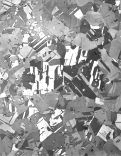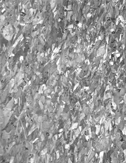 Compositional differences within the metal result in a duplex microstructure, the regions with a somewhat lower tin content being displayed as clusters of coarser grains (left micrograph). (This effect is a result of what is now called critical working.) The repeated cold-working and annealing that was applied to the blade’s edge is still evident in the smaller size and significant deformation of grains in that part of the artifact (right micrograph). The impact of this treatment was only partially erased by a subsequent final working of that edge, that working being responsible for a directional texture of banding that runs southwest-to-northeast across the microstructure shown here.