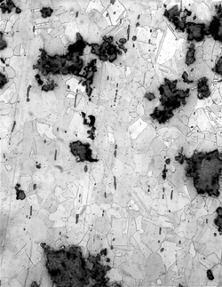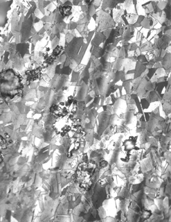 The surface of this specimen contains many clumps of corrosion-filled areas. Treatment of the blade by a sequence of hot- and cold-working is evident in the elongated and fragmented nature of the sulfide-type inclusions (left micrograph). Annealing has produced polyhedral, twinned grains that, like the inclusions, are arrayed in rows (right micrograph). The mixed grain size indicates that there are significant compositional variations throughout the metal, while the finer grain size at the blades edge reflects a higher extent of deformation there.