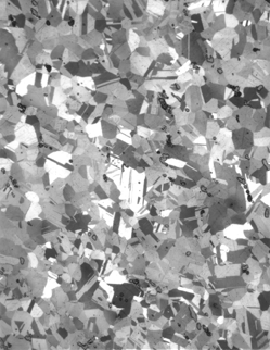 The microstructure consists of polyhedral grains that, in their twinning and lack of distortion, are indicative of annealing after at most a light cold-working. Inclusions are small and scattered throughout the metal without any particular orientation.