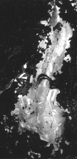 The artifact’s top has been corroded to such an extent that only two islands of sound metal remain. In those areas, however, there are large polyhedral grains that, in their twinning and distortion, indicate a treatment of annealing after moderate cold-working. At the center is a cavity that may be the remnant of a casting defect. Inclusions are rough-shaped and in the one area, at least, appear to be concentrated along one band in the microstructure.