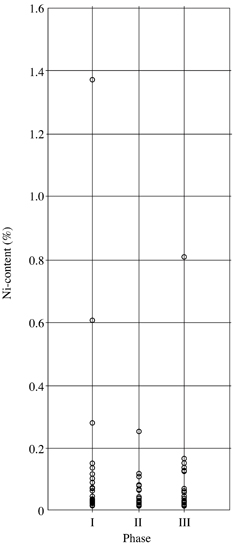 This low occurrence of nickel here is in marked contrast with what we find at several southern Mesopotamian sites over the same period. For example, at Ur during the Early Dynastic period (circa 2600 B.C.–2300 B.C.), close to 65% of the copper-based artifacts were bronzes with an Ni-content of >0.5% (see Ur).