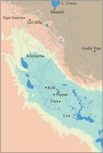 The locations of the sites in the text: Ur, Kish, Nippur, Gawra,