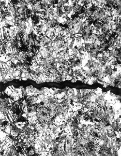 Inv. 30-12-321 Spatula A cut across the broken tang; magnification, 200x Etchant: Unetched (Sn. 16.0%; As, 0.90%; Ni, 0.20%)