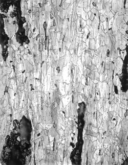 From an edge, one third of the way down from the rivets: magnification, 400x